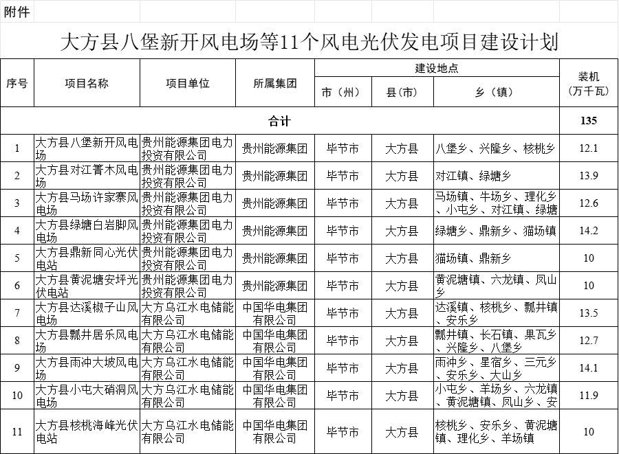 根据国家和我省新能源产业发展有关政策,按照省政府工作部署,我局结合实际研究制定了大方县八堡新开风电场等11个风电光伏发电项目建设计划,总装机135万千瓦,现予以下达。