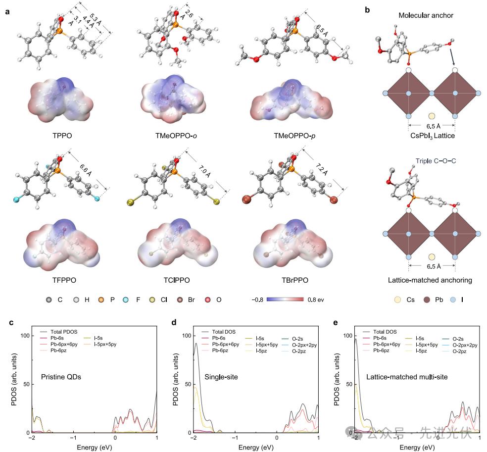 晶格匹配锚定设计:TMeOPPO-p分子中P=O与-OCH₃基团可与Pb²⁺强效配位,且其多位点氧原子间距(6.5 Å)与钙钛矿晶格常数精确匹配,实现多位点同步钝化。