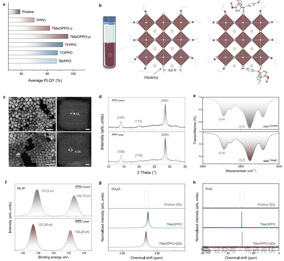 图2系统表征了量子点的微观结构和表面化学性质。STEM图像显示经TMeOPPO-p处理的量子点具有更均匀的立方体形貌和清晰晶格条纹,XRD证实其保持了立方相结构。XPS和核磁共振谱揭示了分子中P=O和-OCH3基团与量子点表面Pb2+的强相互作用,这种相互作用增强了电子屏蔽效应,使Pb 4f峰向低结合能方向移动,31P NMR谱也显示出相应的化学位移变化。