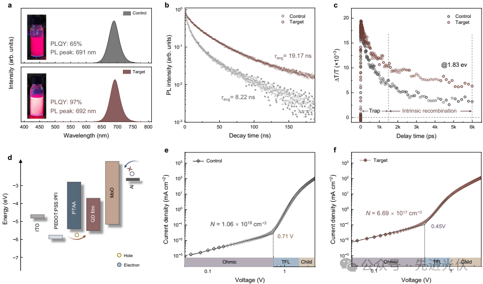 图3揭示了量子点的光学和电学性能提升。经TMeOPPO-p处理的量子点光致发光量子产率高达97%,载流子平均寿命从8.22 ns延长至19.17 ns,瞬态吸收光谱显示其陷阱辅助复合显著减少。空间电荷限制电流测试表明,处理后器件的空穴陷阱密度从1.06×10^18 cm^-3降至6.69×10^17 cm^-3,这为高效电荷注入和传输创造了有利条件。
