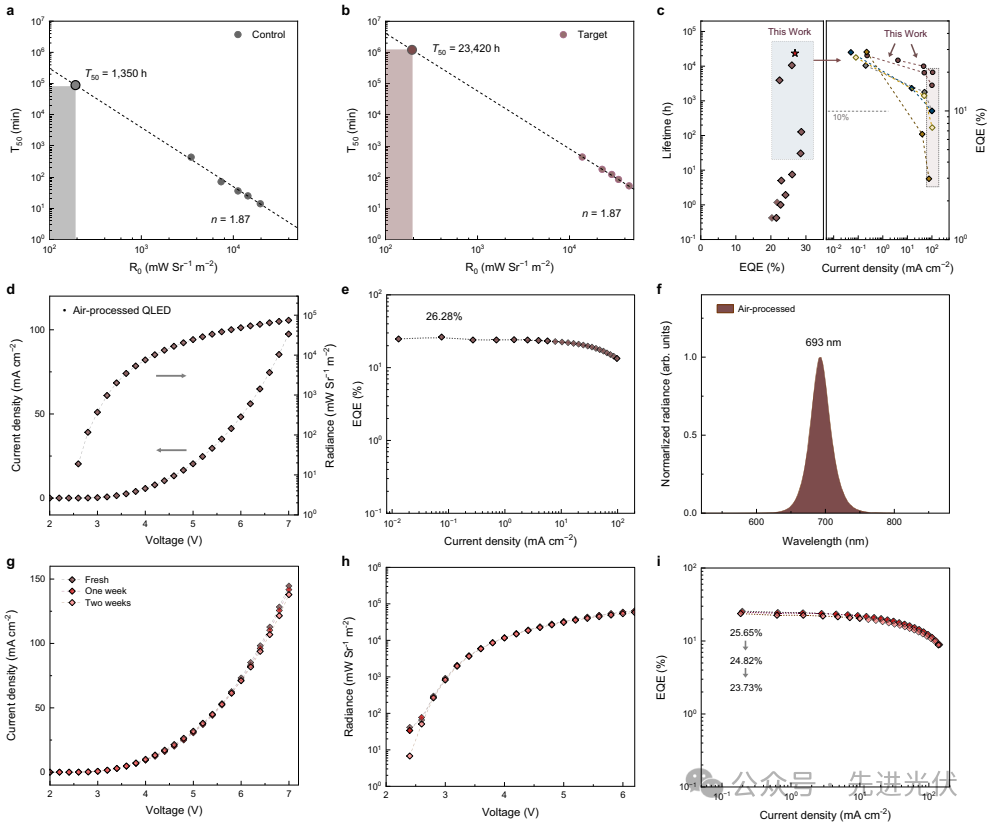 空气中可加工性:全空气工艺制备的QLED效率仍超26%,储存两周后性能无显著衰减,具备产业化应用潜力。