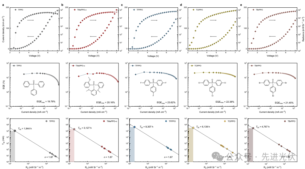 图5综合评估了器件的稳定性和分子设计优势。加速老化测试显示目标器件的T50寿命达23,420小时,远优于对照器件的1,350小时。空气加工器件仍保持26.28%的效率,证明量子点具有优异的水氧稳定性。对比实验表明,晶格匹配的TMeOPPO-p分子在效率(26.91% vs 19.79%)和稳定性(23,420h vs 1,944h)上均显著优于传统TPPO分子,验证了晶格匹配设计策略的优越性。