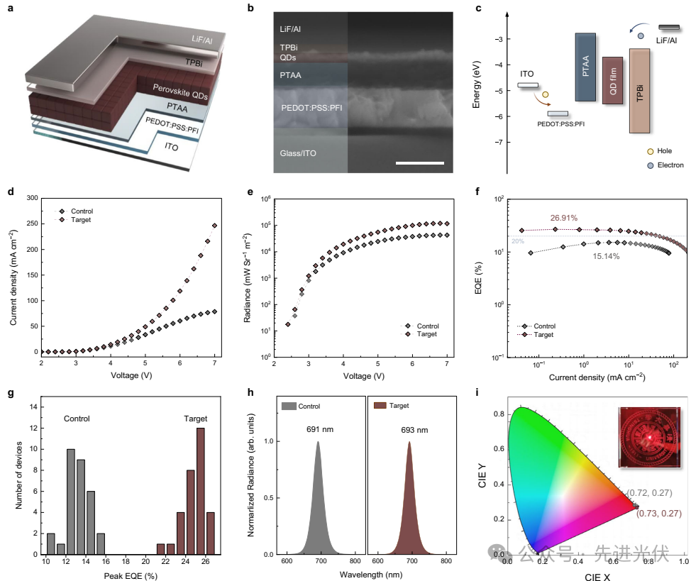图4展示了量子点发光二极管的器件性能。采用TMeOPPO-p处理的器件最大外量子效率达26.91%,辐射亮度达到119,037 mW Sr^-1 m^-2,是对照器件的三倍。30个器件的统计显示平均效率达25.3%,电致发光光谱呈现693 nm的发射峰,色坐标位于(0.73,0.27),表明该策略具有优异的可重复性和色彩纯度。