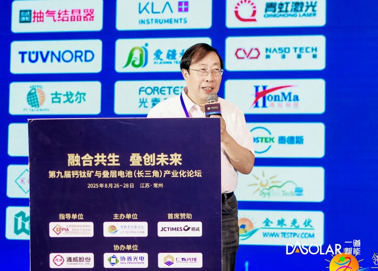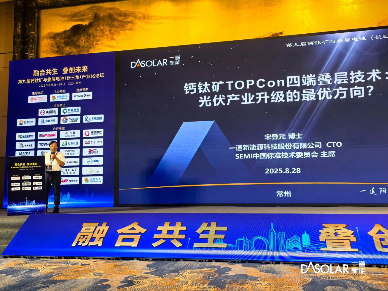 8月27-28日,由中国国际科技促进会钙钛矿产业分会指导、光伏领跑者创新论坛主办的“第九届钙钛矿与叠层电池(长三角)产业化论坛”在常州召开。来自科研机构、电池组件骨干企业、设备材料厂商、投资机构及行业智库代表出席会议。本次会议旨在探讨钙钛矿产业化进程的核心技术与问题,助力钙钛矿光伏技术从实验室到商业化的全链条突破。一道新能CTO宋登元博士受邀参会,并发表了“钙钛矿/TOPCon四端叠层技术:光伏产业升级的必然方向”的特邀讲演,分享了一道新能在钙钛矿/TOPCon四端叠层技术科研与产业化进展。