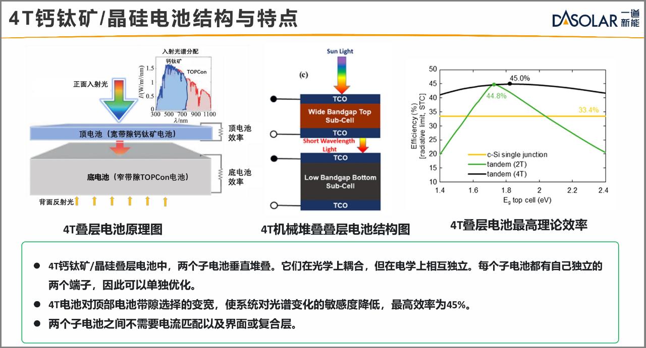 宋登元博士进一步指出,相较于两端钙钛矿/晶硅叠层电池,四端钙钛矿/晶硅叠层电池有更为明显的优势,成为光伏产业升级的必然方向。核心体现在以下方面:一是结构与性能独立性,两个子电池采用垂直堆叠方式,在光学层面实现耦合充分利用光谱,而电学层面相互独立,每个子电池均拥有独立输出端,可针对各自特性单独优化,大幅提升了电池性能调节的灵活性。二是光谱适应性更强,顶部钙钛矿电池的带隙选择范围较宽,在1.6-2eV宽带隙范围内可以实现高效率,降低了整个电池系统对外部光谱变化的敏感度,提升了不同光照条件下的稳定性。三是技术复杂度降低,无需满足两个子电池间的电流匹配要求,同时省去了界面复合层的设计与制备环节,简化了电池结构与制备工艺,有助于降低成本并提升成品率。