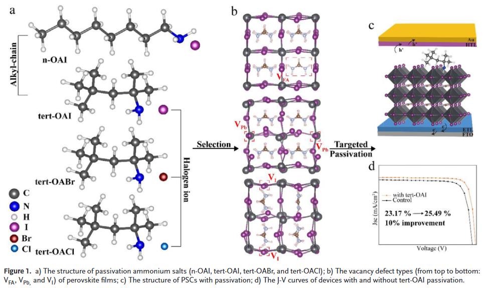 尽管铵盐已成为提升钙钛矿太阳能电池(PSCs)性能的有效策略,但其烷基链和卤素离子在针对特定缺陷类型的优选机制尚不明确。