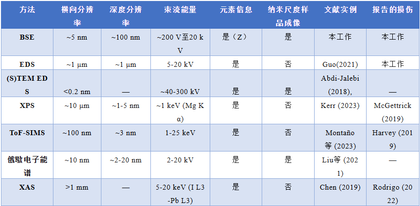直接表征钙钛矿降解现象面临重大挑战,主要原因是钙钛矿会被电子束和离子束损伤(见表1)。这种束流敏感性引起了对表征降解产物准确性的担忧——很难区分由实验条件引起的钙钛矿结构变化和表征技术本身造成的损伤。