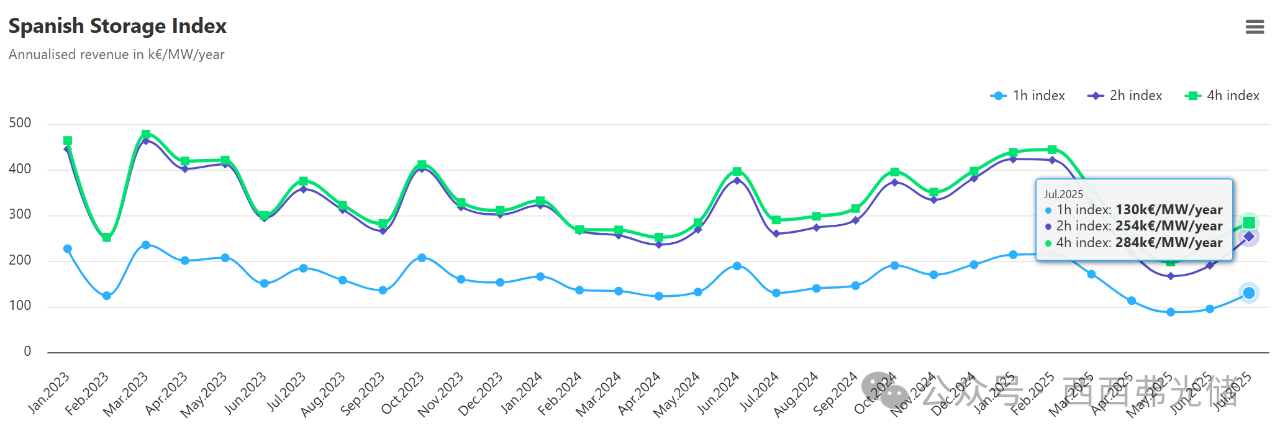 以 2025 年 8 月 27 日为例,OMIE 报告的当日最高电价为 114.32 欧元/兆瓦时 (MWh),最低为 49.85 欧元/兆瓦时,这意味着日内价差达到了 64.47 欧元/兆瓦时。不过,2025 年的平均价差在 24 至 38 欧元/兆瓦时之间。