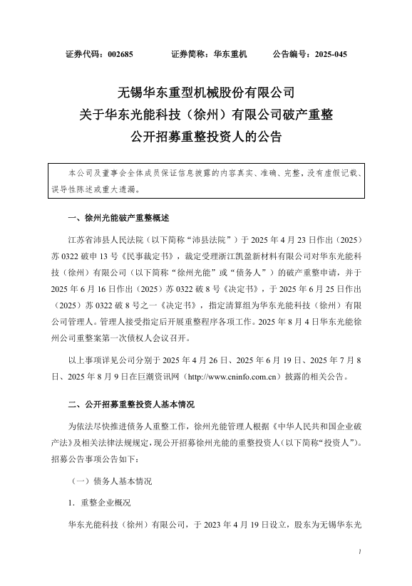 9 月 2 日,华东重机(002685)发布公告,宣布为旗下子公司华东光能科技 (徐州) 有限公司公开招募重整投资人,拟通过股权收购、资产融资、债转股等方式推进重整工作。
