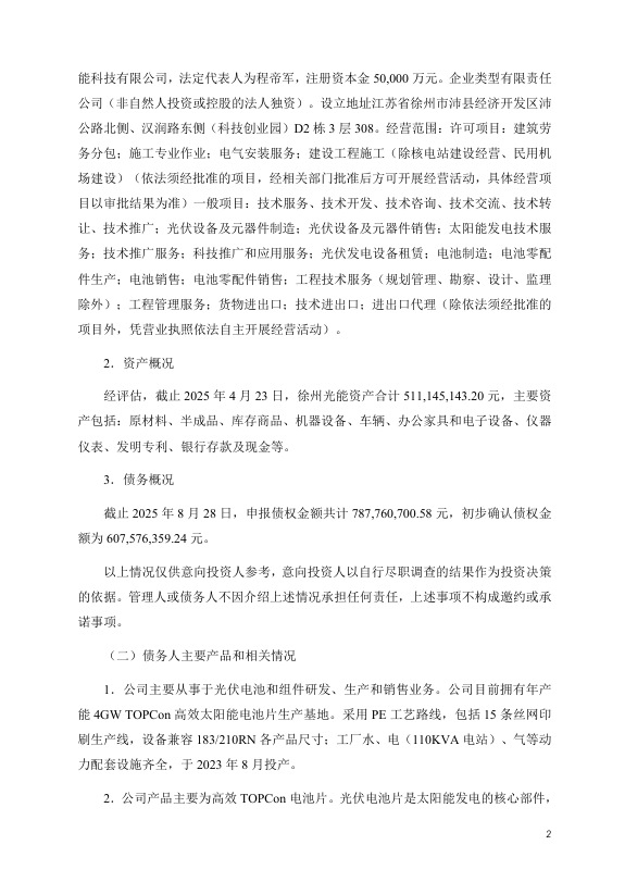 日。公告显示,经评估,徐州光能资产合计 5.11 亿元,截至 8 月 28 日,申报债权金额达 7.88 亿元,初步确认债权金额为 6.08 亿元。实际上,徐州光能的债务问题更为复杂,其母公司无锡华东光能科技有限公司也面临破产重整,无财产担保债权总额为 3.55 亿元,两家公司债权总额合计高达 11.3 亿元。