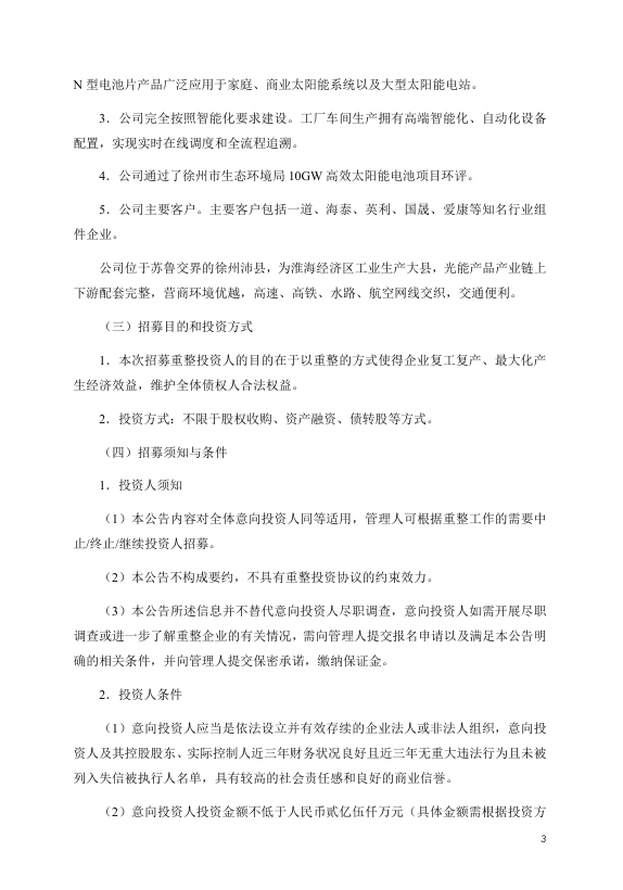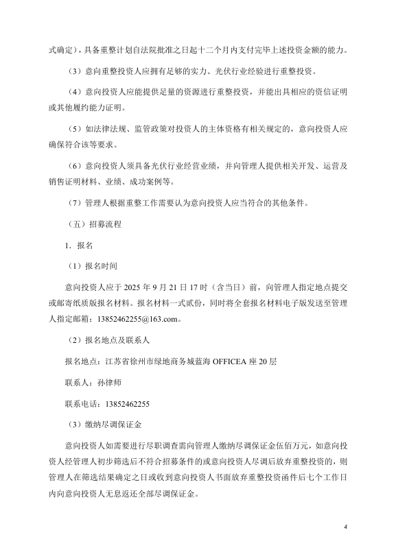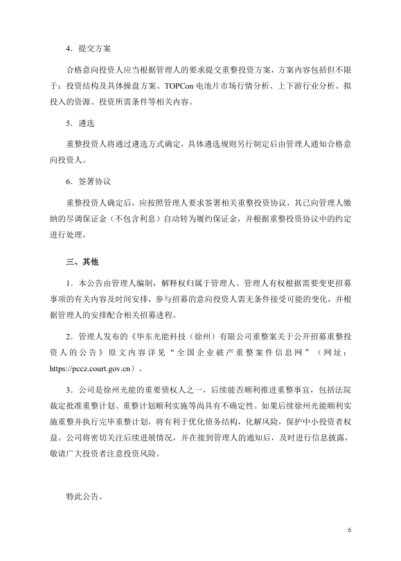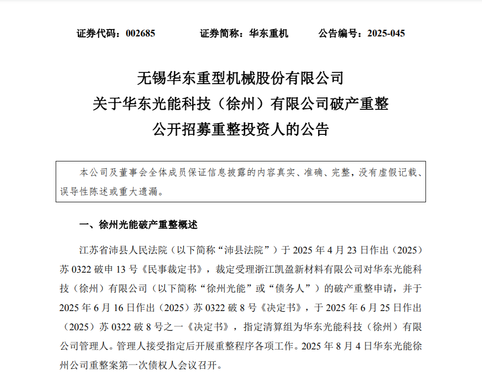 今年 4 月,江苏沛县人民法院裁定受理浙江凯盈新材料有限公司对徐州光能的破产重整申请。6 月 16 日,法院指定清算组担任徐州光能管理人,并于一周后作出相关决定。9 月 1 日,华东重机正式开启招募程序,报名截止日期为 9 月 21