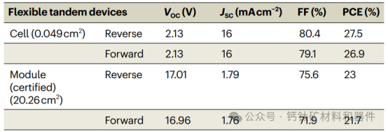 结果,他们实现了柔性全钙钛矿叠层太阳能电池(面积0.49 cm2)的 PCE 为 27.5%和大型柔性模块(面积20.26 cm2)的认证效率 23%,几何填充系数为 95.8%。