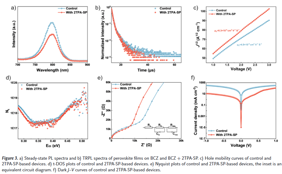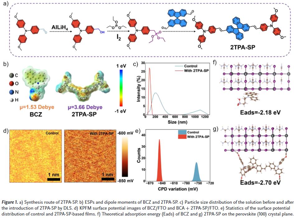 为解决这些问题,内蒙古师范大学刘海瑞、河南大学唐颖和李萌等人设计了一种多功能π-共轭分子2TPA-SP,其以螺芴为桥接骨架,能与咔唑类SAMs形成强π–π堆叠,增强薄膜致密性和界面覆盖。分子中的甲氧基可与未配位的Pb²⁺配位,有效钝化界面缺陷;三苯胺单元则提升空穴提取与传输能力。