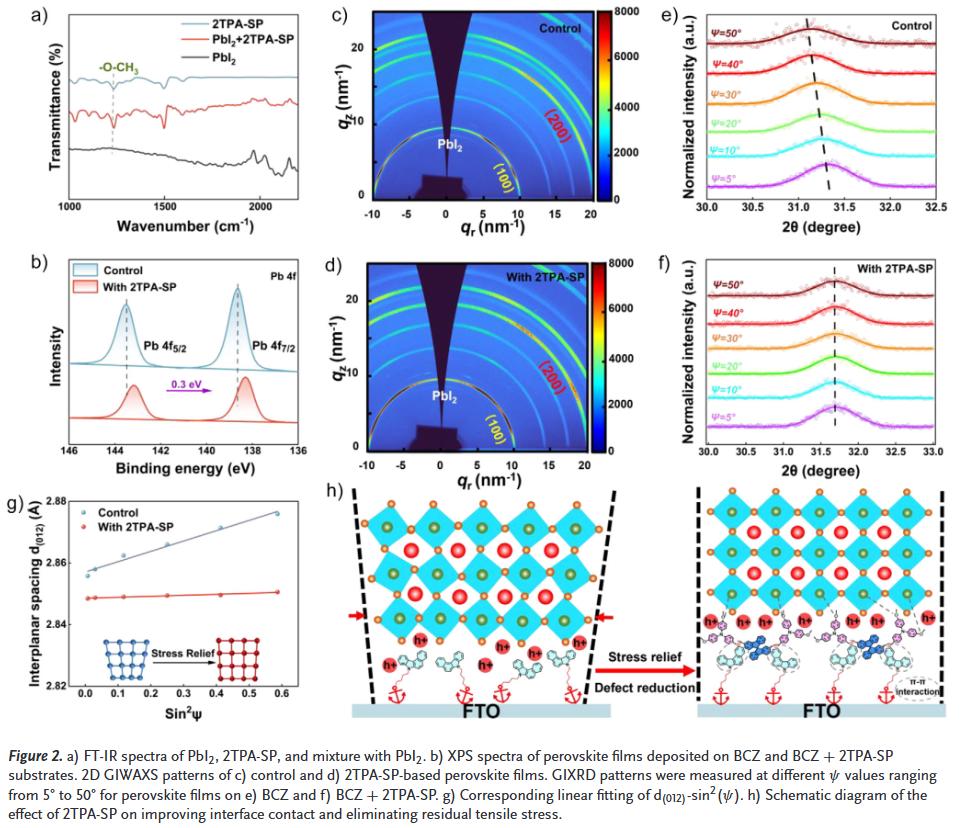 - 多功能界面调控:甲氧基与Pb²⁺配位钝化缺陷,三苯胺单元增强空穴提取,同时缓解钙钛矿薄膜残余应力,提升结晶质量。