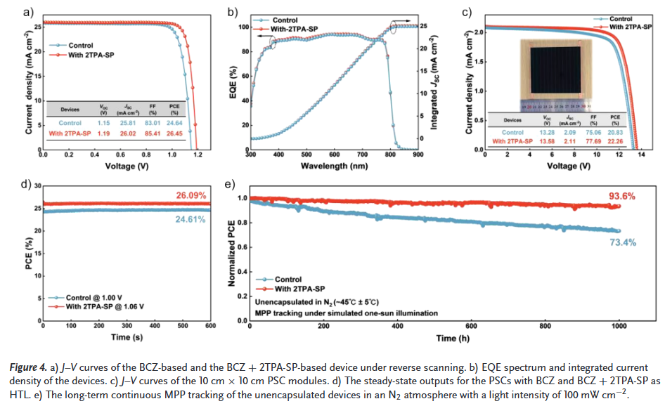 基于2TPA-SP的器件实现了26.45%的光电转换效率(PCE),并在AM 1.5G光照下连续运行1000小时后仍保持93.6%的初始效率。此外,10 cm × 10 cm迷你组件也实现了22.26%的高效率,显示出该策略的可扩展性与实际应用潜力。