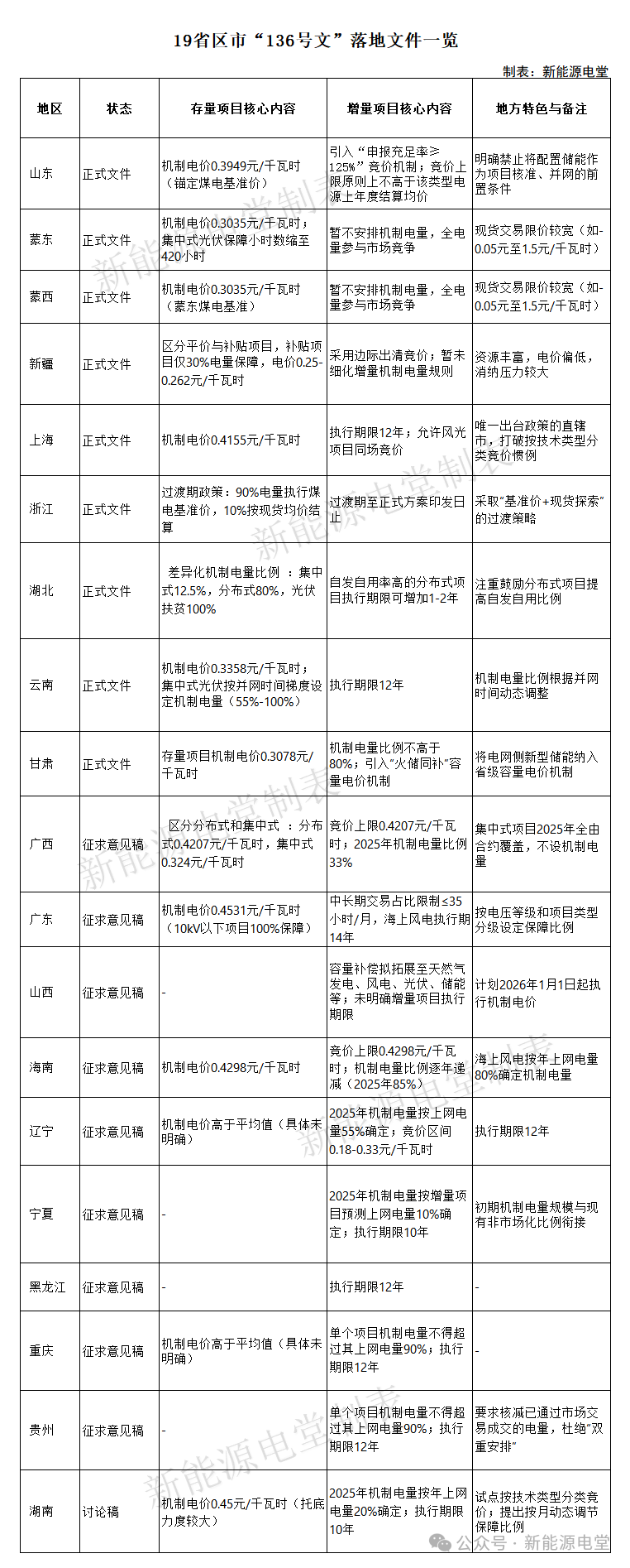 截至2025年9月4日,全国已有19个省区市出台了“136号文”的落地文件。这些文件在存量与增量项目的界定、机制电价、机制电量以及执行期限等核心内容上存在差异,体现了“平稳过渡”与“市场导向”相结合的原则。
