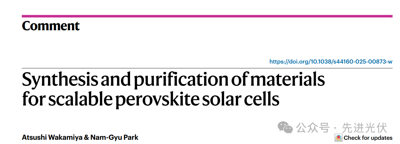 Wakamiya, A., Park, NG. Synthesis and purification of materials for scalable perovskite solar cells. Nat Synth (2025).https://doi.org/10.1038/s44160-025-00873-w