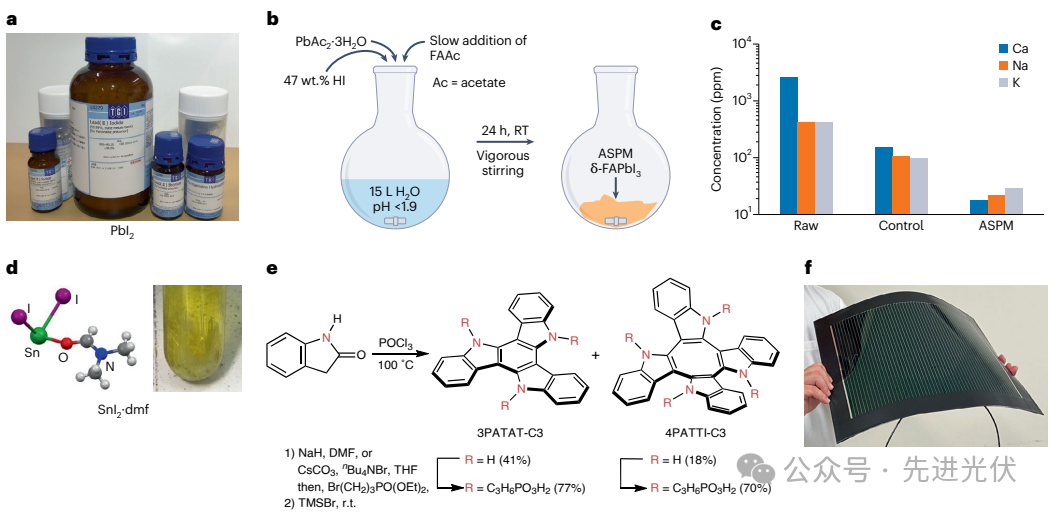 图1系统展示了钙钛矿太阳能电池关键材料的合成与纯化方法。该图通过五个子图(a-e)全面呈现了从原料提纯到器件集成的完整技术路线:图a显示商业化的高纯PbI2(99.999%)仍含2000ppm水分,通过升华纯化后显著提升了钙钛矿薄膜质量;图b展示公斤级水相合成甲脒碘化铅(FAPbI3)微晶的工艺流程,实现了绿色规模化生产;图c的杂质分析证实水相合成微晶纯度达99.994%,金属离子含量低于6ppm;图d介绍溶剂配位SnI2前驱体可有效抑制Sn4+杂质,改善锡基钙钛矿光电性能;图e展示三足/四足三氮杂蒄衍生物空穴传输材料的分子设计,其磷酸基团定向修饰电极表面润湿性。这些创新方法共同解决了钙钛矿太阳能电池产业化面临的原料纯度、工艺兼容性和界面稳定性等核心问题。