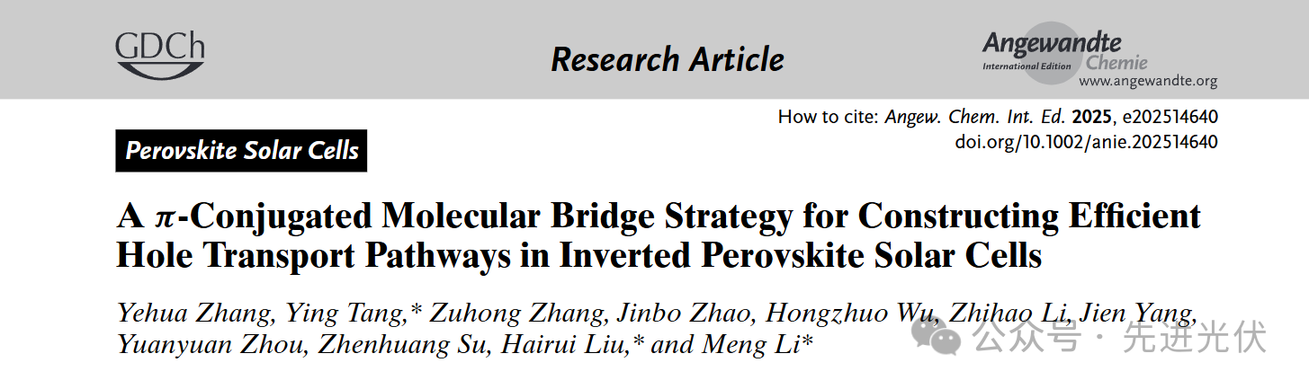 Zhang, Y., Tang, Y., Zhang, Z., et al. A π-Conjugated Molecular Bridge Strategy for Constructing Efficient Hole Transport Pathways in Inverted Perovskite Solar Cells. Angew. Chem. Int. Ed. 2025, e202514640.