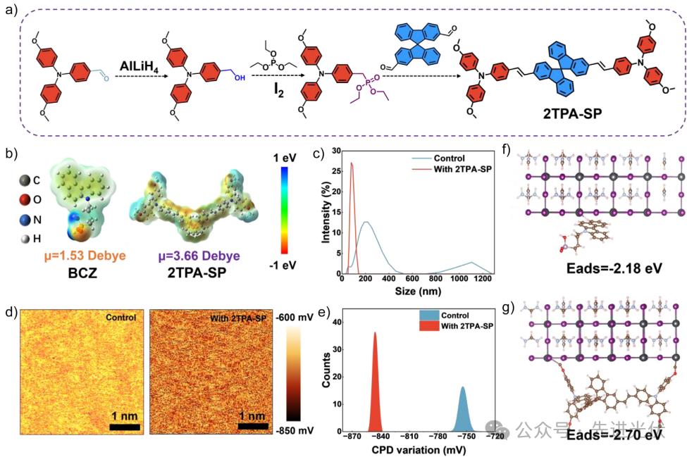 强π–π堆叠分子桥设计:2TPA-SP分子中螺芴桥联的π共轭骨架与BCZ咔唑基团形成强相互作用,抑制SAM聚集,提升HTL薄膜均匀性与致密性。