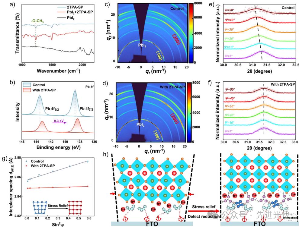 残余应力显著释放:GIXRD测试表明2TPA-SP使钙钛矿薄膜残余应力从78.53 MPa降至7.52 MPa,有效抑制晶格畸变与界面降解。