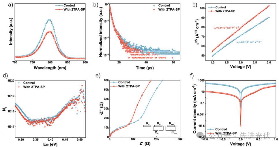 图3系统研究了载流子动力学行为。稳态荧光光谱显示2TPA-SP处理薄膜的PL强度降低且淬灭更显著,时间分辨荧光寿命从1453.6 ns缩短至844.6 ns,表明空穴提取效率提升。空间电荷限制电流测试测得空穴迁移率从4.8×10-5 cm2 V-1 s-1提高至6.3×10-5 cm2 V-1 s-1。热导纳谱和阻抗分析证实陷阱态密度从2.92×1015 cm-3降至2.14×1015 cm-3,复合电阻增大,这些数据共同揭示了π-π共轭桥在促进电荷传输、抑制非辐射复合方面的关键作用。