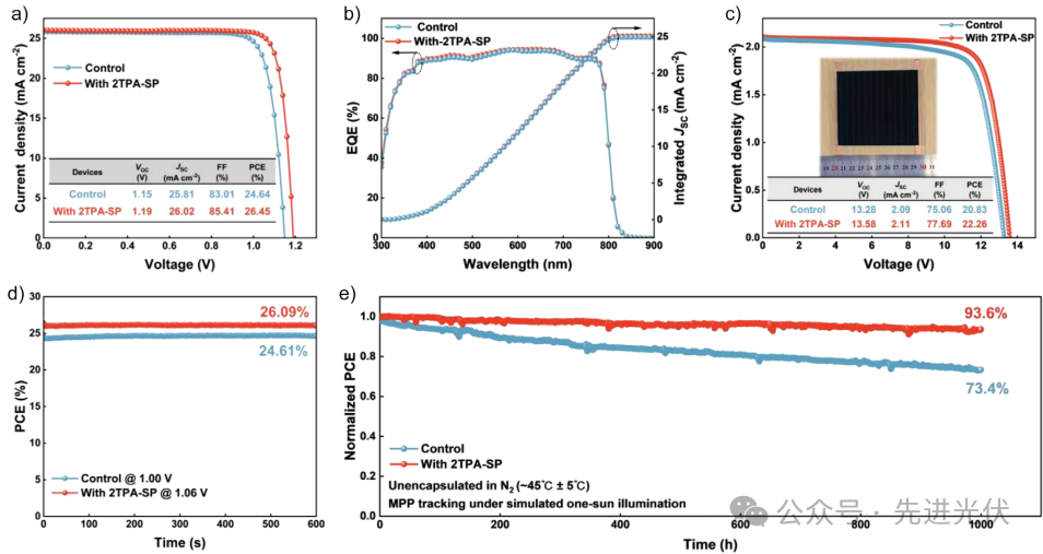 图4展示了器件性能与稳定性突破。冠军器件效率达26.45%(Voc=1.19 V,Jsc=26.02 mA cm-2,FF=85.41%),外量子效率积分电流与J-V测试结果高度吻合。10×10 cm2微型组件效率提升至22.26%,验证了技术的可扩展性。最大功率点跟踪显示器件在1000小时连续运行后仍保持93.6%的初始效率,这种卓越的稳定性源于2TPA-SP对界面缺陷的钝化和残余应力的消除,为钙钛矿太阳能电池商业化提供了重要参考。