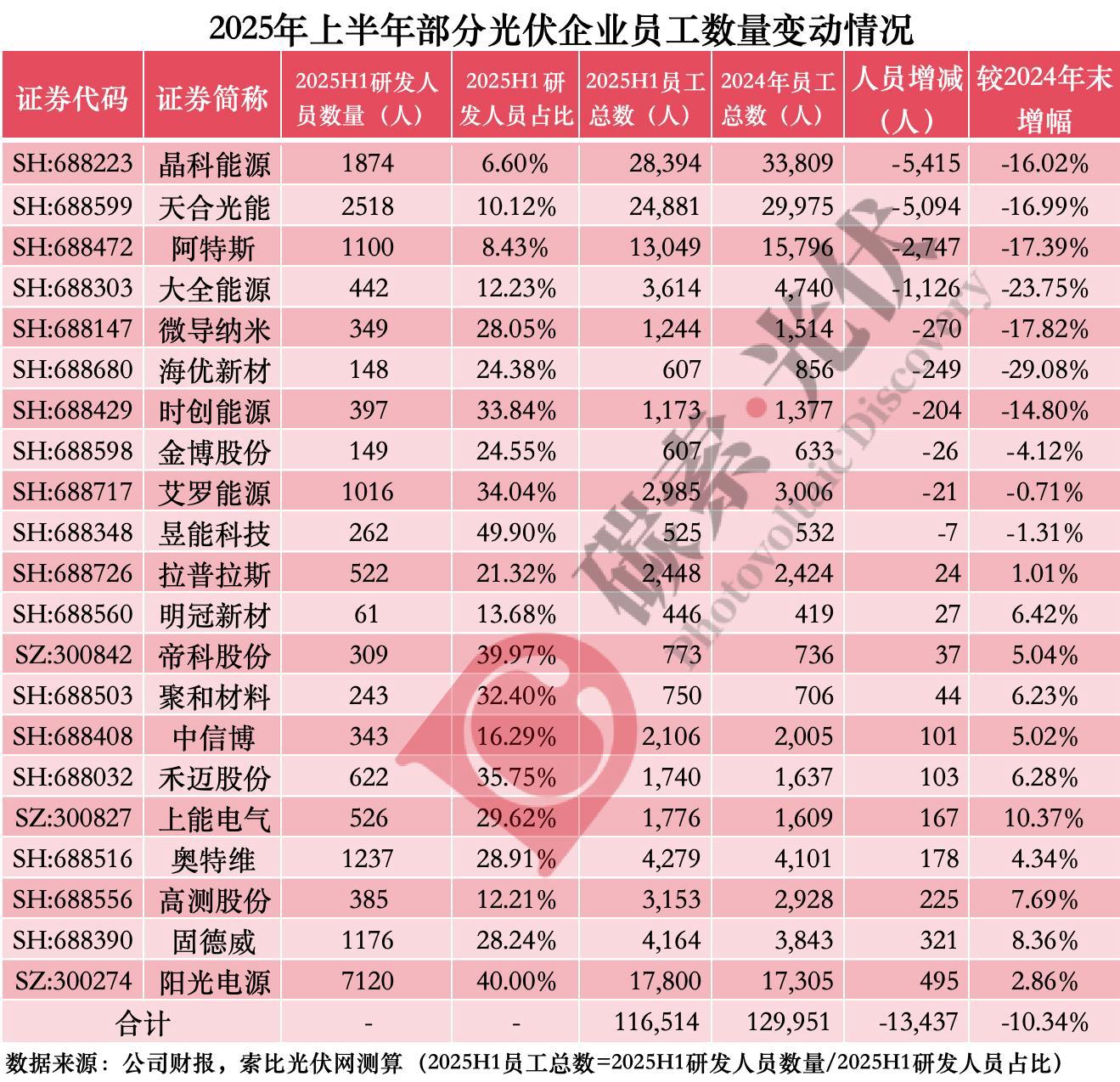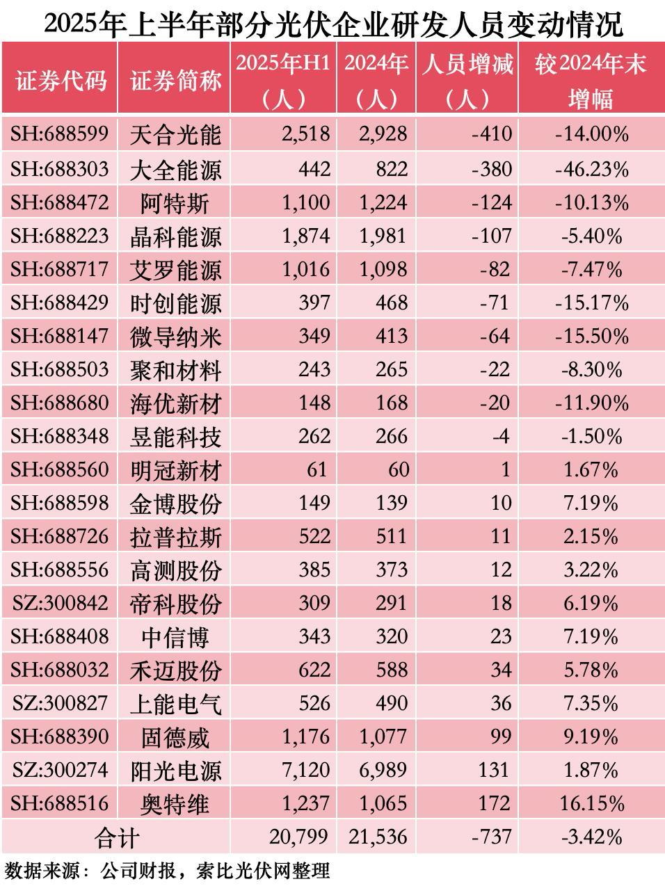 而前述21家披露研发人员的企业,研发人员数量从2024年末的2.15万人下降至2025年上半年末的2.08万人,减少了737人。尤其是前述4家合计缩编1.44万人的光伏企业,研发人员由2024年末的6955人下降至2025上半年末的5934人,减少了1021人。