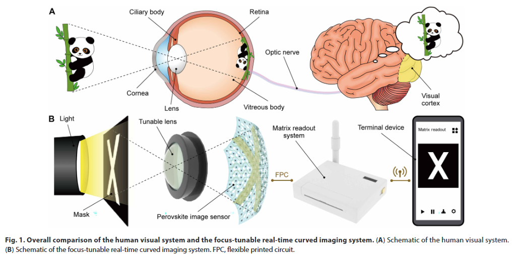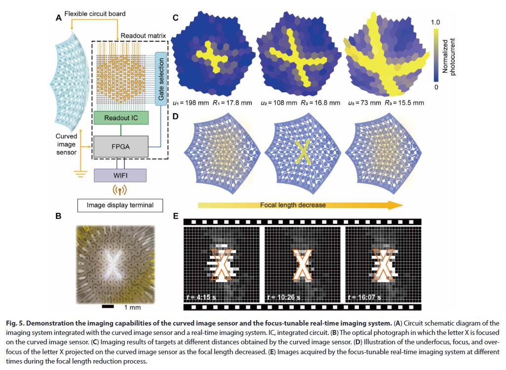 通过将图像传感器与可调透镜结合,通过同步调节传感器和透镜曲率,实现了不同距离下的清晰成像。进一步地,通过将图像传感器与读出矩阵和无线数据采集组件集成,展示了具备实时调焦成像能力的成像系统。