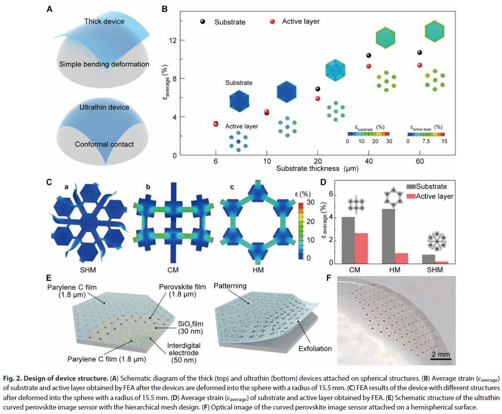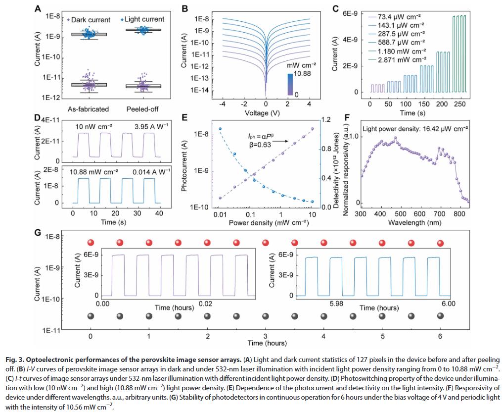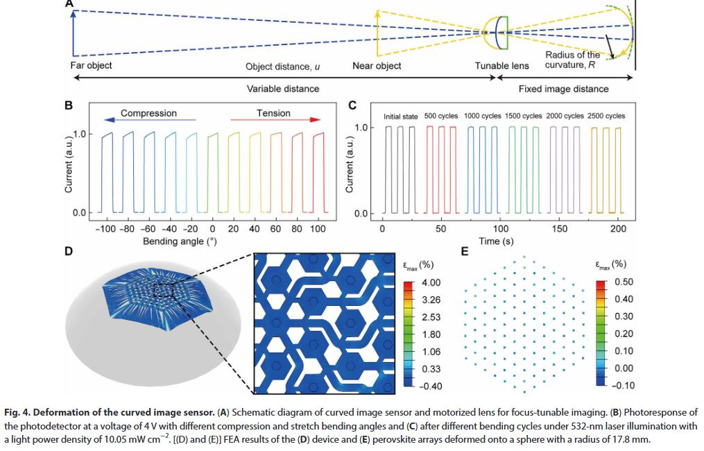 本研究北京航空航天大学潘曹峰、吴文强、中国科学院北京纳米能源与系统研究所高文超、香港理工大学Xun Han和香港科技大学范智勇等人提出了一种基于可调曲率钙钛矿曲面图像传感器的可调焦实时曲面成像系统。采用聚对二甲苯C薄膜进行防水封装,展示了具有分级网格设计的超薄钙钛矿曲面图像传感器,可在不同曲率球面上实现贴合,并在变形过程中保持机械稳定性。该图像传感器具有低检测限(10 nW/cm²)和长期稳定的动态光响应。