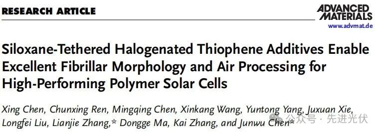 X. Chen, C. Ren, M. Chen, et al. “ Siloxane-Tethered Halogenated Thiophene Additives Enable Excellent Fibrillar Morphology and Air Processing for High-Performing Polymer Solar Cells.” Adv. Mater. (2025): e12197.