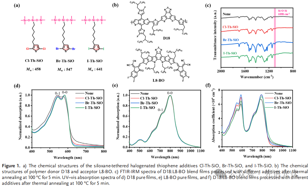 图1a展示三种添加剂的化学结构,硅氧烷提供疏水性,卤代噻吩增强与活性层材料的相互作用。图1c通过FTIR证实添加剂在100°C退火后仍保留在薄膜中(Si-O-Si特征峰≈1098 cm⁻¹)。图1d–f显示UV-vis光谱中添加剂处理后的D18和L8-BO薄膜出现红移和吸收系数提升,表明分子堆积更加有序。