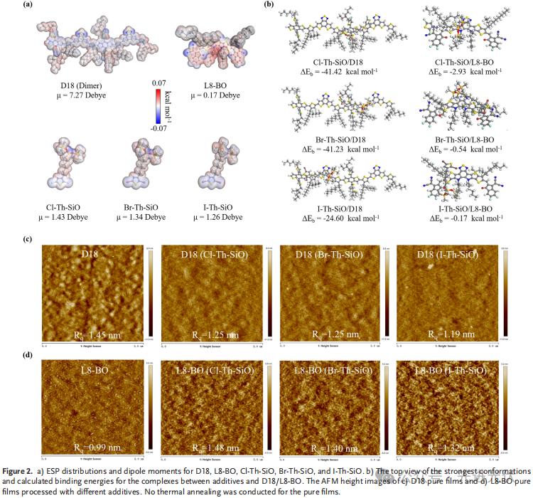 图2a ESP计算显示Cl-Th-SiO具有最大偶极矩,与D18和L8-BO的结合能最强(-41.42 kcal/mol)。图2b–d AFM图像显示添加剂处理后D18和L8-BO纯膜形成更均匀的纤维结构,表面粗糙度降低,有利于后续层间渗透。