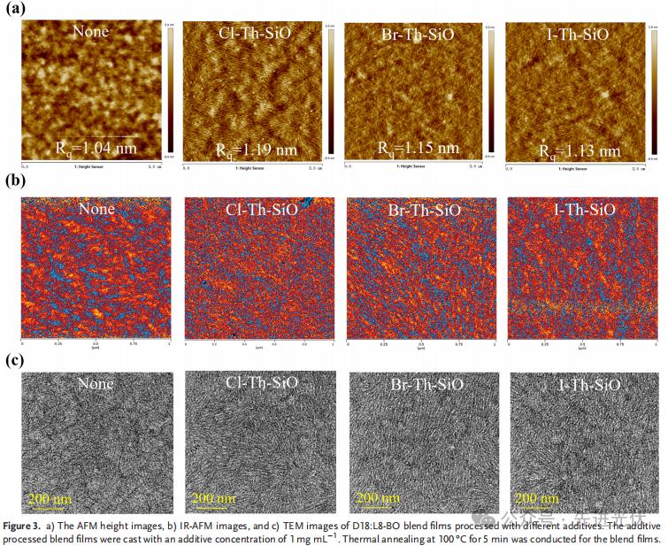 图3a AFM显示添加剂处理后共混膜形成清晰纤维网络,Cl-Th-SiO处理样品纤维直径最小(33 nm)。图3b IR-AFM显示受体相(蓝色)分布更均匀。TEM图像进一步证实纤维状形貌,Cl-Th-SiO样品结构最清晰。GIWAXS显示分子堆积更紧密,π–π距离减小至3.613 Å。