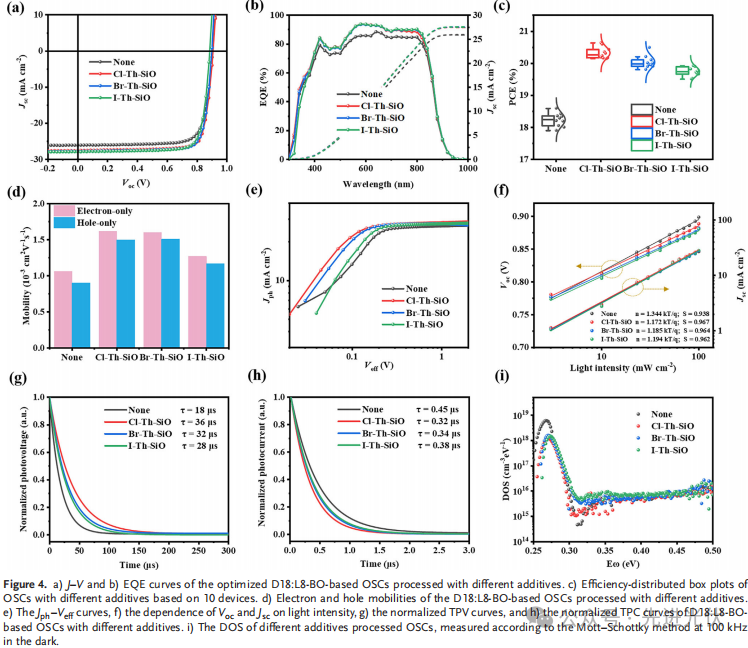 图4a–b J-V和EQE曲线显示Cl-Th-SiO器件效率最高(20.64%),EQE响应全面提升。图4d SCLC测试显示空穴和电子迁移率提升且更平衡(μₕ/μₑ≈1.06)。图4e–h 显示激子解离率(Pdis)和电荷收集率(Pcoll)显著提升,载流子寿命延长至36 μs,提取时间缩短至0.32 μs。图4i 陷阱态密度降低至2.10×10¹⁶ cm⁻³。