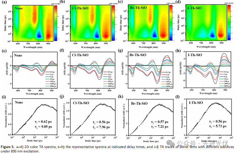 fs-TA光谱显示添加剂处理后激子解离时间缩短(τ₁从0.62 ps降至0.56 ps),表明更快的电荷转移与更低的复合损失。