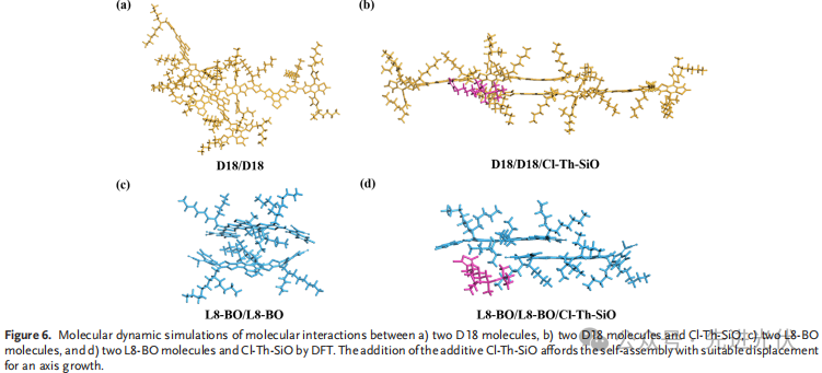 模拟显示Cl-Th-SiO可促进D18和L8-BO分子共面堆叠与轴向生长,解释纤维形貌的形成机制。