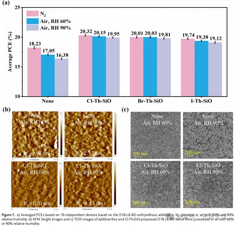 图7a显示即使在90% RH空气中,Cl-Th-SiO仍保持19.95%的平均效率。图7b–c AFM和TEM表明添加剂能有效抑制湿度引起的相分离,保持纤维网络结构。