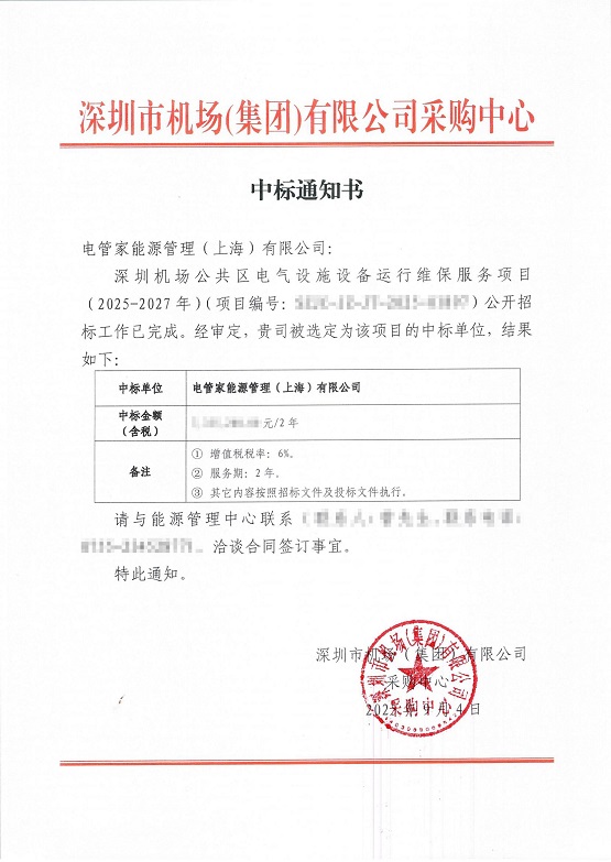 近日,电管家集团股份有限公司(以下简称:电管家集团)在电力服务领域再传捷报!旗下子公司电管家能源管理(上海)有限公司凭借多年积累的技术实力、丰富项目经验及卓越服务能力,成功中标深圳机场电气设施设备运行维保服务项目,为集团深耕大型交通枢纽电力运维市场再添重要成果。