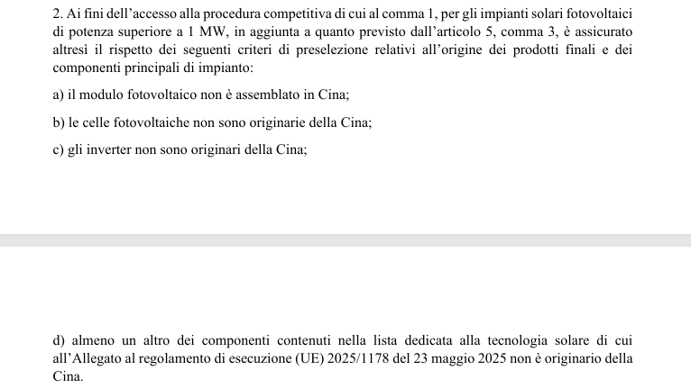 自 2025 年 8 月 27 日起,MASE 发布的 “MASE No. 220/2025” 法令正式生效。该法令为单体容量不超过 1 兆瓦(MW)的光伏系统开设特殊招标通道,规定参与招标的光伏系统需满足多项关键条件:光伏组件不得在中国组装;光伏电池不得来自中国;逆变器不得为中国生产;至少一项其他核心组件(如支架、接线盒等)必须符合 “非中国” 要求,且根据欧盟实施条例 2025/1178 附件,至少一种其他组件不得源自中国。投标人在投标申请时必须提交承诺函,保证符合上述产地要求,否则无法获得意大利的补贴。