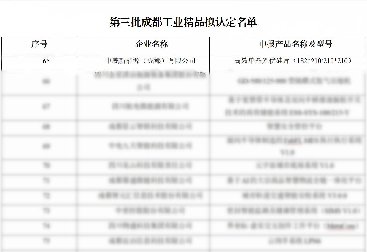中威新能源(成都)有限公司入选“第三批成都工业精品”认定名单