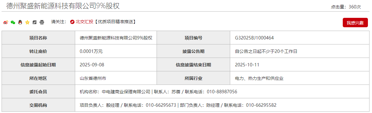 9月8日,中国电建集团江西省电力建设有限公司转让德州聚盛新能源科技有限公司9%股权,转让底价0.0001万元,转让公司注册资本2088.80万元,经营范围包括电力行业高效节能技术研发;光伏发电设备租赁;资源再生利用技术研发;工程管理服务;技术服务、技术开发、技术咨询、技术交流、技术转让、技术推广;太阳能发电技术服务;光伏设备及元器件销售等。