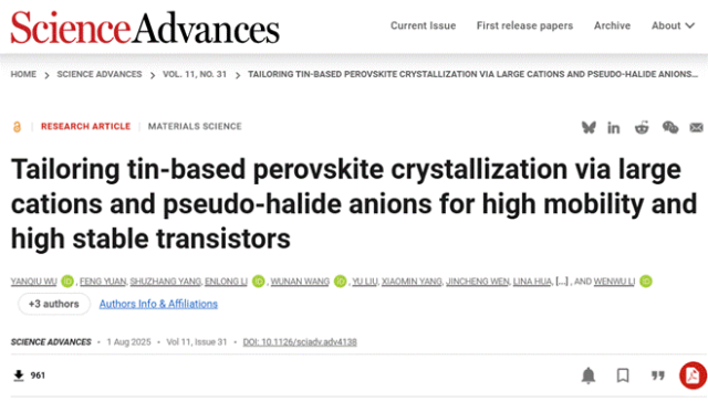 Yanqiu Wu; Yuan Feng; Shuzhang Yang; Enlong Li; W. Wang; et al. Tailoring tin-based perovskite crystallization via large cations and pseudo-halide anions for high mobility and high stable transistors.Science Advances.
