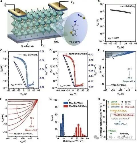 (A)钙钛矿TFT的器件结构示意图;(B)基于CsFASnI3的TFT典型传递曲线;(C) TEAI-CsFASnI3和(D) TEASCN-CsFASnI3转移曲线;(E) TEAI-CsFASnI3和(F) TEASCN-CsFASnI3 TFT的输出曲线;(G) TEAI-CsFASnI3和TEASCN-CsFASnI3TFTs迁移率的统计直方图;(H) TEASCN-CsFASnI3与先前报道钙钛矿TFT平均迁移率的比较。