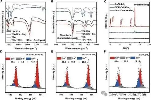 (A和 B) TEASCN、TEASCN + SnI 2、TEAI 和 TEAI + SnI2 FTIR光谱;(C)退火前CsFASnI3,TEAI-CsFASnI3和TEASCN-CsFASnI3钙钛矿XRD衍射薄膜; (D) TEASCN-CsFASnI ,(E) TEAI-CsFASnI3和(F) CsFASnI3钙钛矿薄膜在Sn 3d区域的XPS光谱。