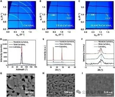 (A) CsFASnI3, (B) TEAI-CsFASnI3和(C) TEASCN-CsFASnI3钙钛矿薄膜GIWAXS图案; (D) 积分环在q r= 1.0−1处的方位角曲线; (E) CsFASnI3 , TEAI-CsFASnI3和TEASCN-CsFASnI3钙钛矿薄膜的XRD图谱; (F) CsFASnI3,TEAI-CsFASnI3和TEASCN-CsFASnI3钙钛矿薄膜XRD图谱(100)平面部分放大视图。(G) CsFASnI3,(H)
