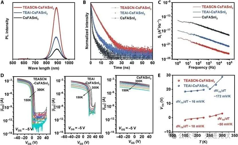 (A) CsFASnI 3 , TEAI-CsFASnI3和TEASCN-CsFASnI3薄膜的PL 和(B) TRPL 光谱。(C) CsFASnI3,TEAI-CsFASnI3和TEASCN-CsFASnI3器件在0 V时的噪声电流曲线。(D) CsFASnI3,TEAI-CsFASnI3和TEASCN-CsFASnI3TFT典型的温度转移曲线相关图。(E) TEAI-CsFASnI3和 TEASCN-CsFASnI3TFT的温度阈值电压相关图。