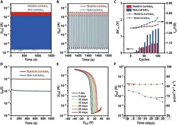 (A) TEAI-CsFASnI3连续开/关测试图;(B) TEASCN-CsFASnI3 TFT连续 1500个循环局部放大图。(C) TEAI-CsFASnI3和TEASCN-CsFASnI3 TFTs循环转移曲线测量期间的阈值电压和导通电流的变化。(D) TEAI-CsFASnI3和TEASCN-CsFASnI3 TFTs(VGS的 = VDS= −30 V)负偏置应力稳定性。(E) TEASCN-CsFASnI3TFTs的转移曲线随氮气中储存时间的变化。(F) TEASCN-CsFASnI3 TFT的导通电流和迁移率在氮气中随储存时间的变化。