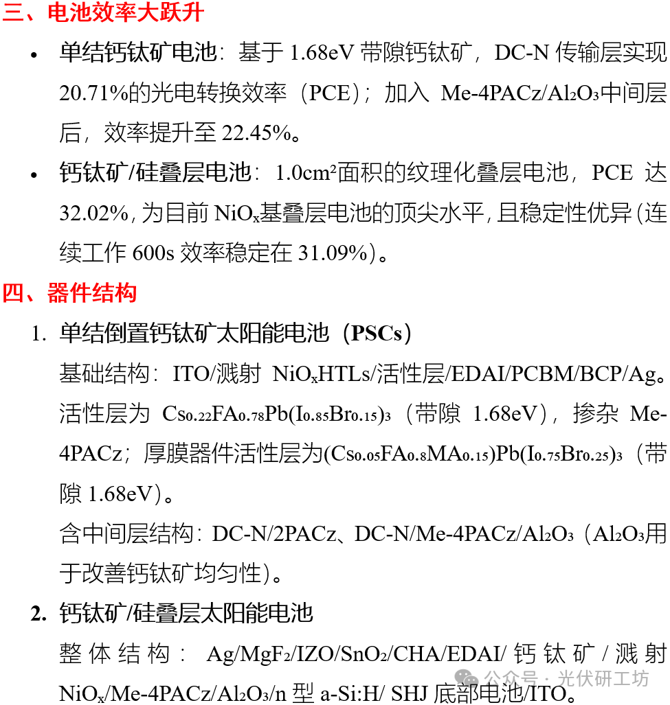 作为全球光伏领域的新一代核心技术,钙钛矿电池凭借其卓越的效率潜力备受瞩目。其中,单结钙钛矿电池的理论转换效率上限可达33%,叠层结构钙钛矿电池更是高达43%,这两项指标均大幅超越传统晶硅太阳能电池29.4%的效率极限。通过持续的技术创新,团队成功攻克了薄膜材料广域带隙精准调控、高质量结晶工艺优化等一系列关键难题,先后3次刷新1.68eV宽带隙与1.50eV常规带隙钙钛矿电池的光电转换效率世界纪录。