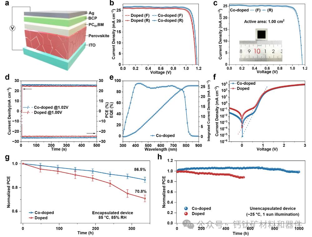 这种分子杂化桥接策略的实施使倒置钙钛矿太阳能电池实现了 26.64% 的功率转换效率(认证为 26.34%),跻身该器件架构报告的最高效率之列。此外,这些器件表现出出色的运行稳定性,在最大功率点的 一个太阳光标准照射下连续运行 1000 小时后仍保持其初始效率的 98.5%。
